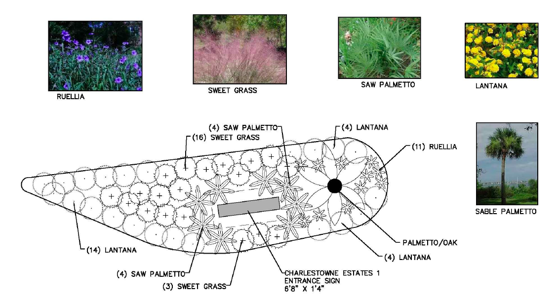 We are excited to share the plans to redesign the front entrance to Charlestowne Estates 1 (left). The plan is to make it similar to that of Charlestowne Landing with a lot of sweet grass plants, along with some lantana, ruellia and saw palmetto plants. There will be a tree towards the backend that could be a palmetto or oak, nothing that would block the view of Old Towne Road. There will also be a sign that will be constructed that will have the neighborhood name and logo that will face either side of Old Towne Road. On the smaller side of the sign (visible as you are leaving the neighborhood) will be a small plaque listing all of those that funded the project. We would also like to dedicate the entrance to Ms. Gasque, who has tirelessly maintained and taken care of the fronts bed for years. Without his love and support, we would not have the entrance we have today!