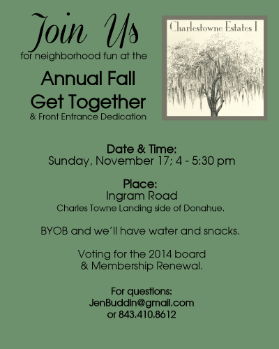 We’ll meet at the front entrance on the Charles Towne Landing side of Ingram from 4 – 5:30 pm. We’ll have snacks and water. BYOB and come chat with your neighbors. See the attached invitation for full details; this is also being delivered to you tomorrow and Thursday.